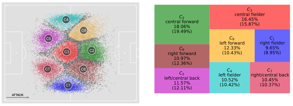 How it works: First, they compute the rating of a given player in a given match as the linear combination of features describing its actions during the match. Features comprise the number of successful passes, duels, fouls, and more. The weights are derived from a linear Support Vector Classifier (SVC). It has been trained on the aggregated features of the team to predict the outcome of the match. In parallel, a k-means model computes the player role as the region it played in during the match. Finally, they rank players by role by ordering them using their ratings.
